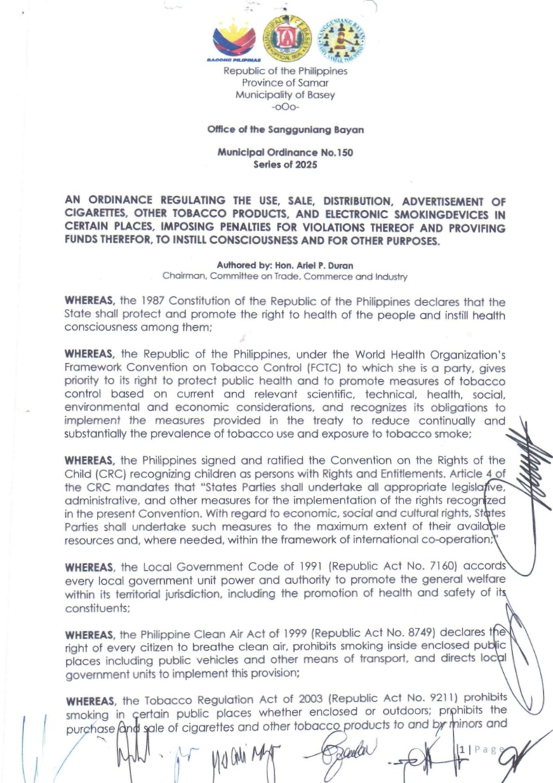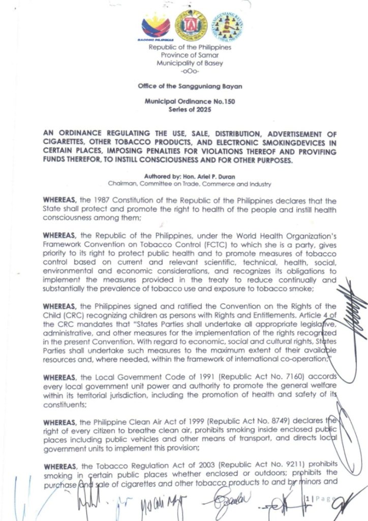 The municipality of Basey, Samar enacted Municipal Ordinance No. 150 s. 2025 or the Comprehensive Smoke-Free and Vape-Free Ordinance.