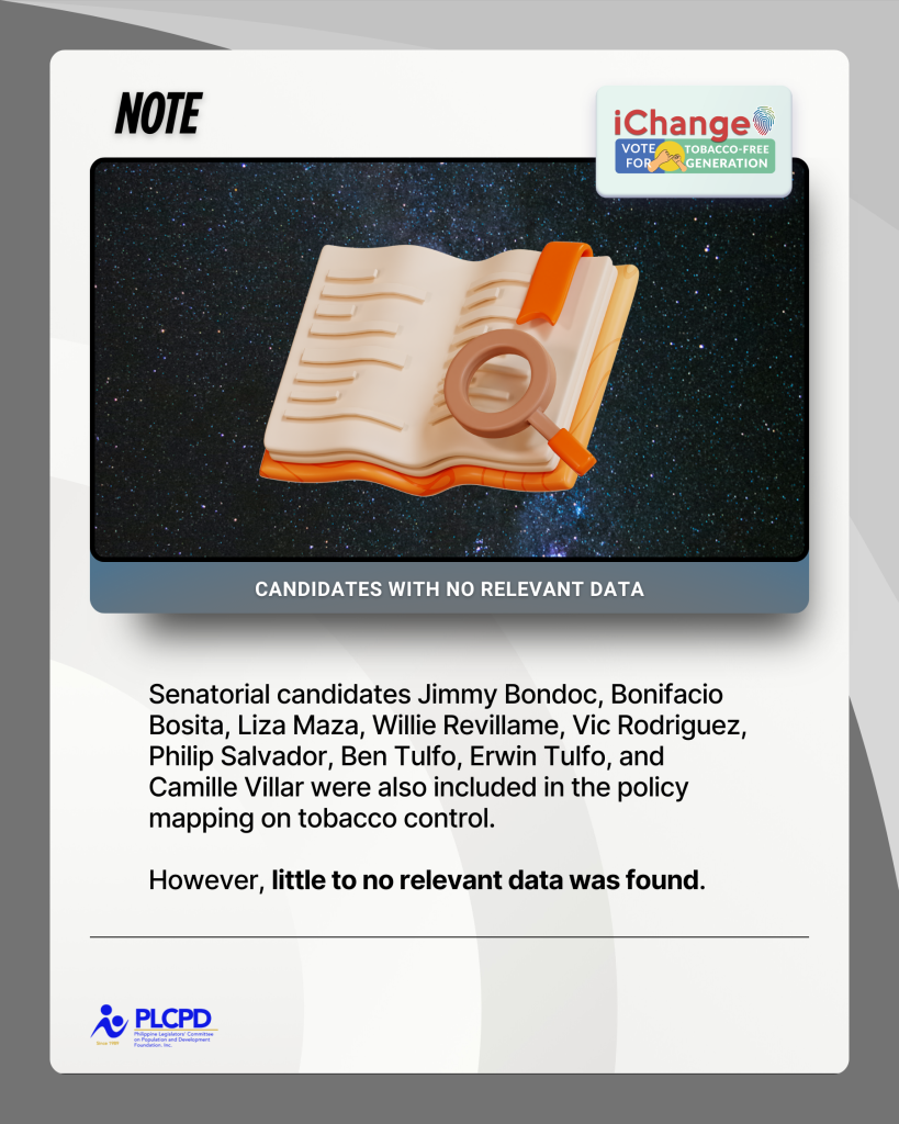 See the stances of the 2025 senatorial candidates on key policy issues in tobacco control.