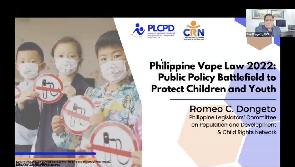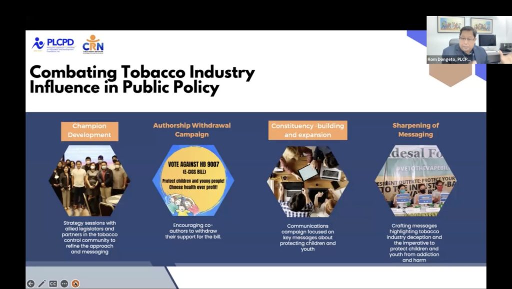 The Child Rights Network, represented by its Convenor, PLCPD Executive Director Romeo Dongeto, participated in the webinar and launch of the Asian Tobacco Industry Index (TIII) 2023, organized by the Southeast Asia Tobacco Control Alliance and the Global Center for Good Governance in Tobacco Control on November 15, 2023. Dongeto highlighted the network’s experience in the advocacy for protecting children and youth in the regulation of electronic smoking devices in the Philippines and the fight against tobacco industry interference in legislation. The webinar called on governments in Asia to safeguard public health and align with the World Health Organization Framework Convention on Tobacco Control Article 5.3, which mandates state parties to protect tobacco control policies from the vested interests of the tobacco industry.