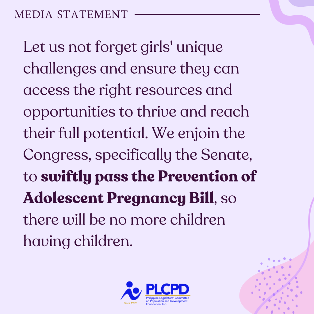 Let us not forget girls’ unique challenges and ensure they can access the right resources and opportunities to thrive and reach their full potential. We enjoin the Congress, specifically the Senate, to swiftly pass the Prevention of Adolescent Pregnancy Bill, so there will be no more children having children.