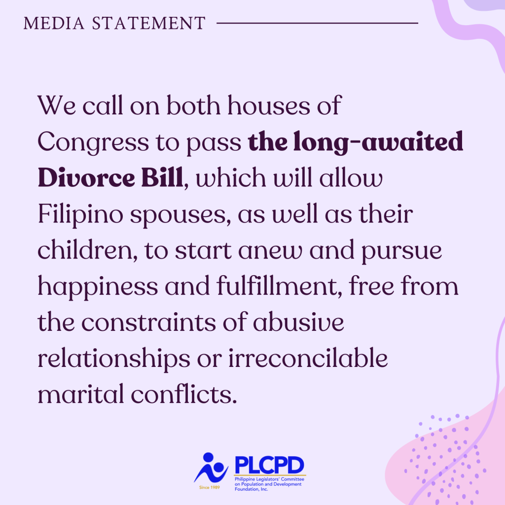 Lastly, we call on both houses of Congress to pass the long-awaited Divorce Bill, which will allow Filipino spouses, as well as their children, to start anew and pursue happiness and fulfillment, free from the constraints of abusive relationships or irreconcilable marital conflicts.
