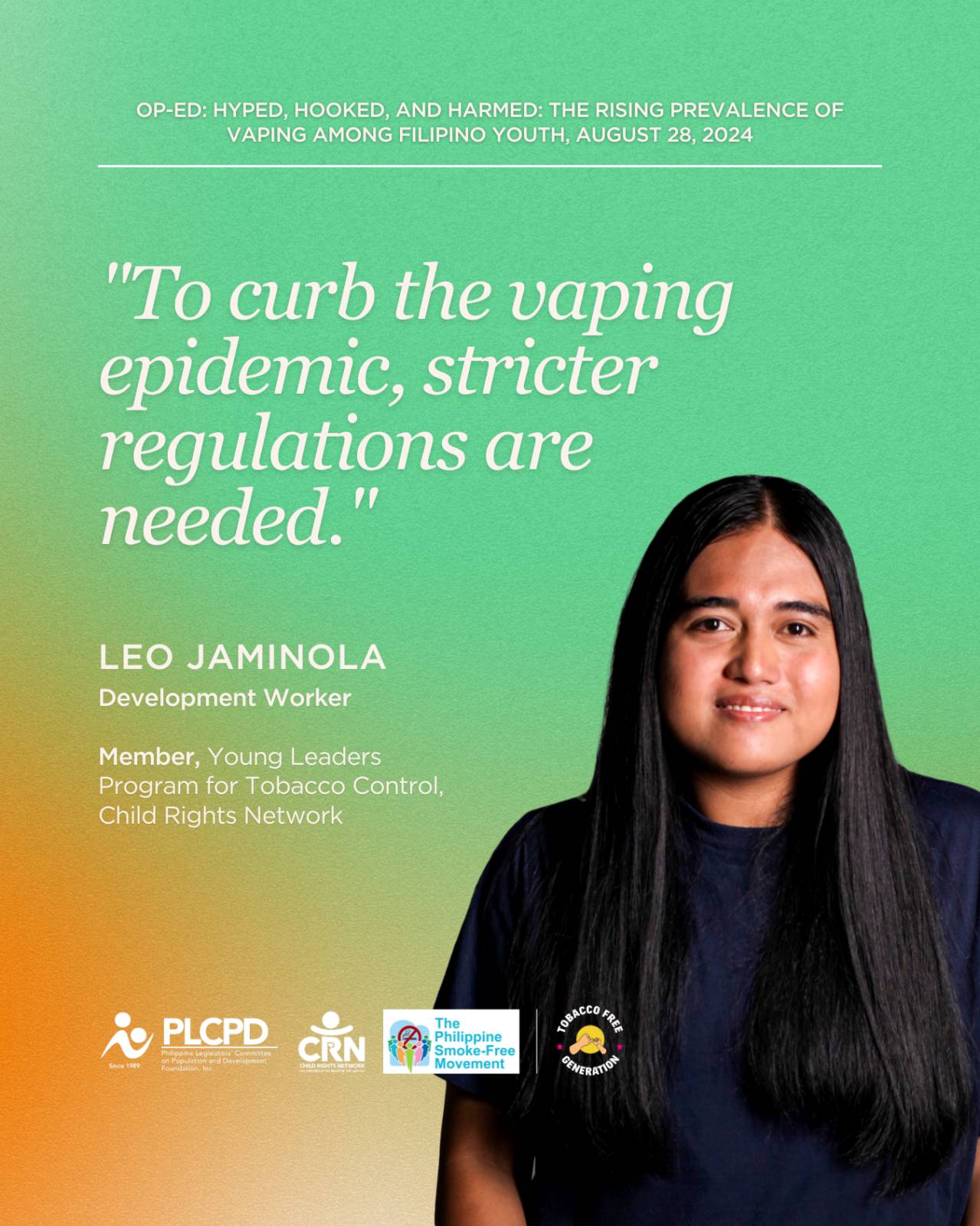 I join my fellow youth in calling for the amendment of RA 11900 to raise the minimum age to 21, ban flavors, ban online sale and marketing, and bring the regulation of vapes back to the FDA.