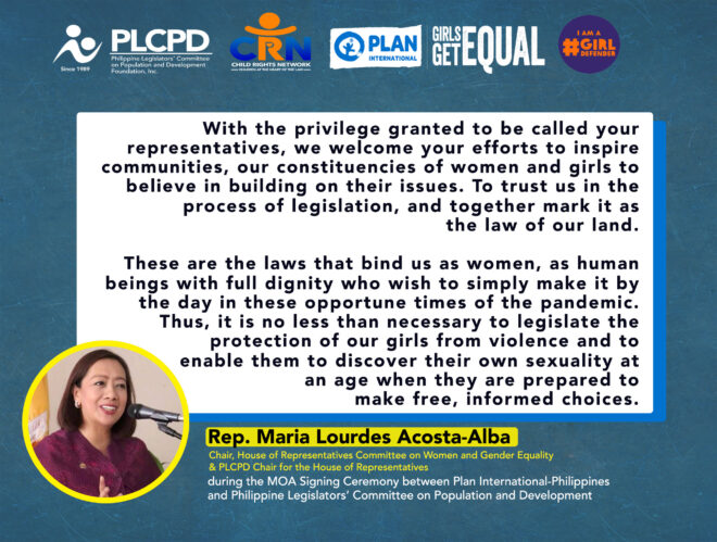 The Philippine Legislators’ Committee on Population and Development (PLCPD) and Plan International – Philippines signed a Memorandum of Agreement for their continuing partnership for the protection of children from sexual violence online and offline.