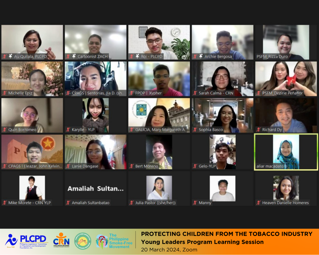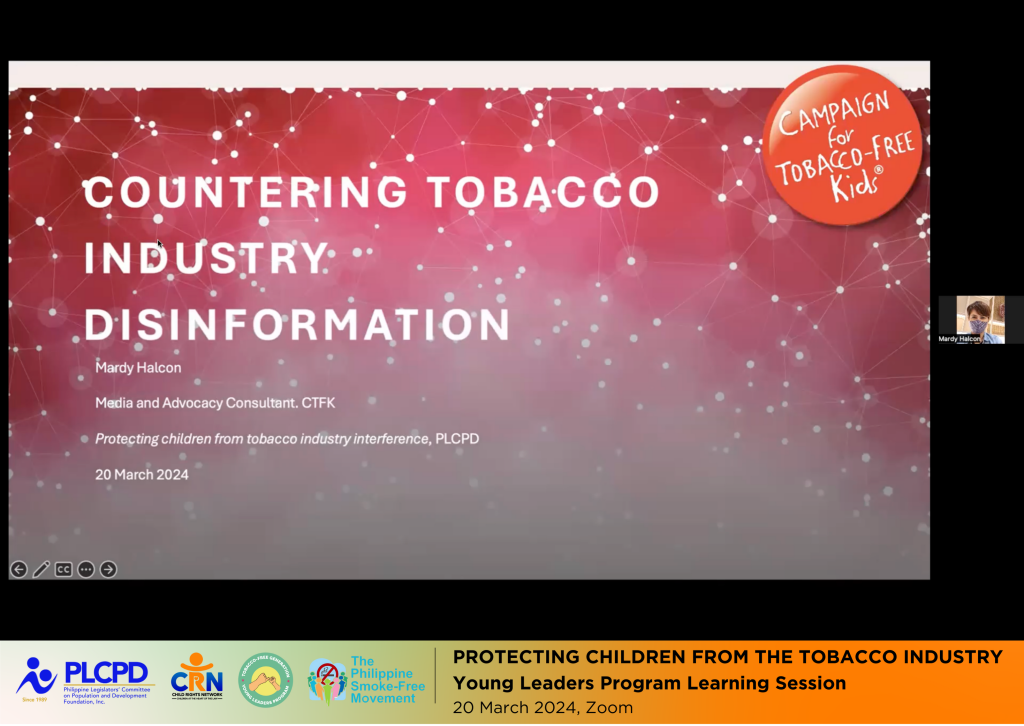 In preparation for World No Tobacco Day on May 31, PLCPD convened youth leaders on Wednesday to plan the campaign calling to protect children from the tobacco industry. Resource persons from the Campaign for Tobacco-Free Kids, ExplainedPH, and PITIK Bulag talked about strategies that the youth can adopt to counter tobacco industry disinformation, including enhancing tobacco control campaigning on social media and utilizing art and cartooning for effective public health advocacy. This knowledge building session, organized in partnership with the Philippine Smoke-Free Movement, provided a platform for youth to unite in their efforts to combat the pervasive influence of the tobacco industry and amplify calls for pro-health tobacco control initiatives.