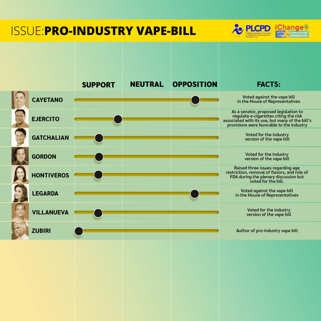 Pro-industry Vape Bill. Regulation of the importation, manufacture, sale, packaging, distribution, use, and communication of electronic nicotine and non-nicotine delivery systems (ENDS) and heated tobacco products (HTPs). According to the Word Health Organization, ENDS, also known as electronic cigarettes or vapes, are addictive and not harmless, and should be strictly regulated. Use of these products by adolescents can lead to nicotine addiction. In the Philippines, there is an existing regulatory framework for ENDS and HTPs that bans flavors, restricts sale and use to those below 21 years old and non-smokers, and assigns FDA as the lead regulatory agency. However, the recently passed Vape bill by Congress reverses these existing measures by allowing flavors, lowering the age restriction to 18, and transferring the regulation to DTI. The bill is being criticized by health advocates and advocates of children’s rights as anti-health, and anti- youth. The bill has been ratified by both houses of Congress to date.