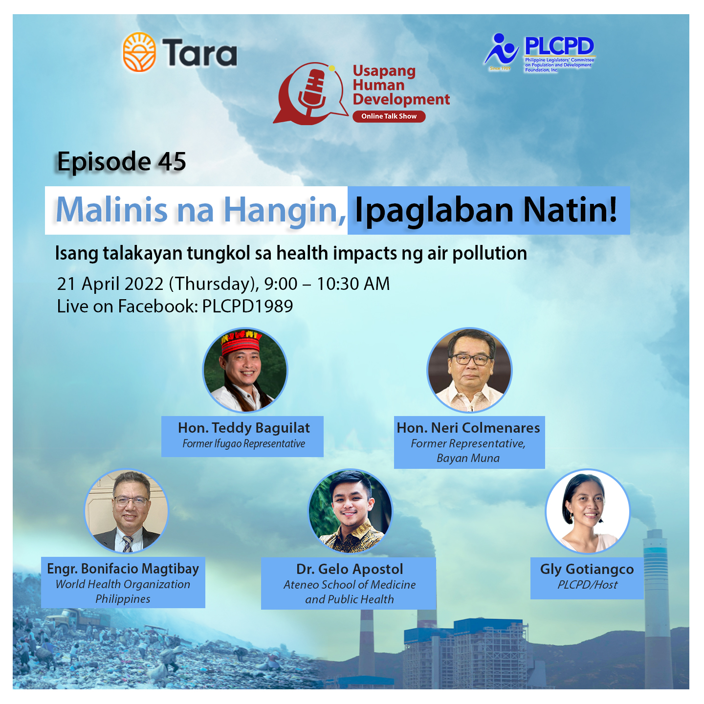 In the 45th episode of the Usapang Human Development Series, the Philippine Legislators’ Committee of Population and Development (PLCPD) gathered environment and health experts and advocates, including former legislators, to discuss the health implications of air pollution and possible solutions, frameworks, strategies, and measures to improve the quality of air in the country. This episode was hosted by Ms. Glyziel Gotiangco, Advocacy and Partnerships Officer of PLCPD.