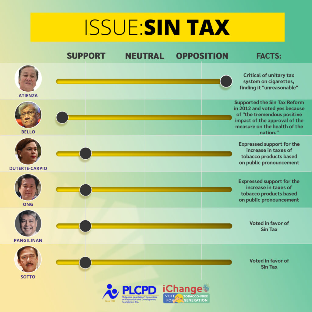 Sin Tax Reform Laws. A series of increases in taxes on tobacco products and alcoholic beverages to curb consumption and ultimately reduce illnesses caused by alcohol and tobacco use. These include Republic Acts (RAs) 10351, 11346, and 11467. Revenues from the sin taxes are used to fund the implementation of Universal Health Care Law and other programs such as assistance to tobacco producing regions.