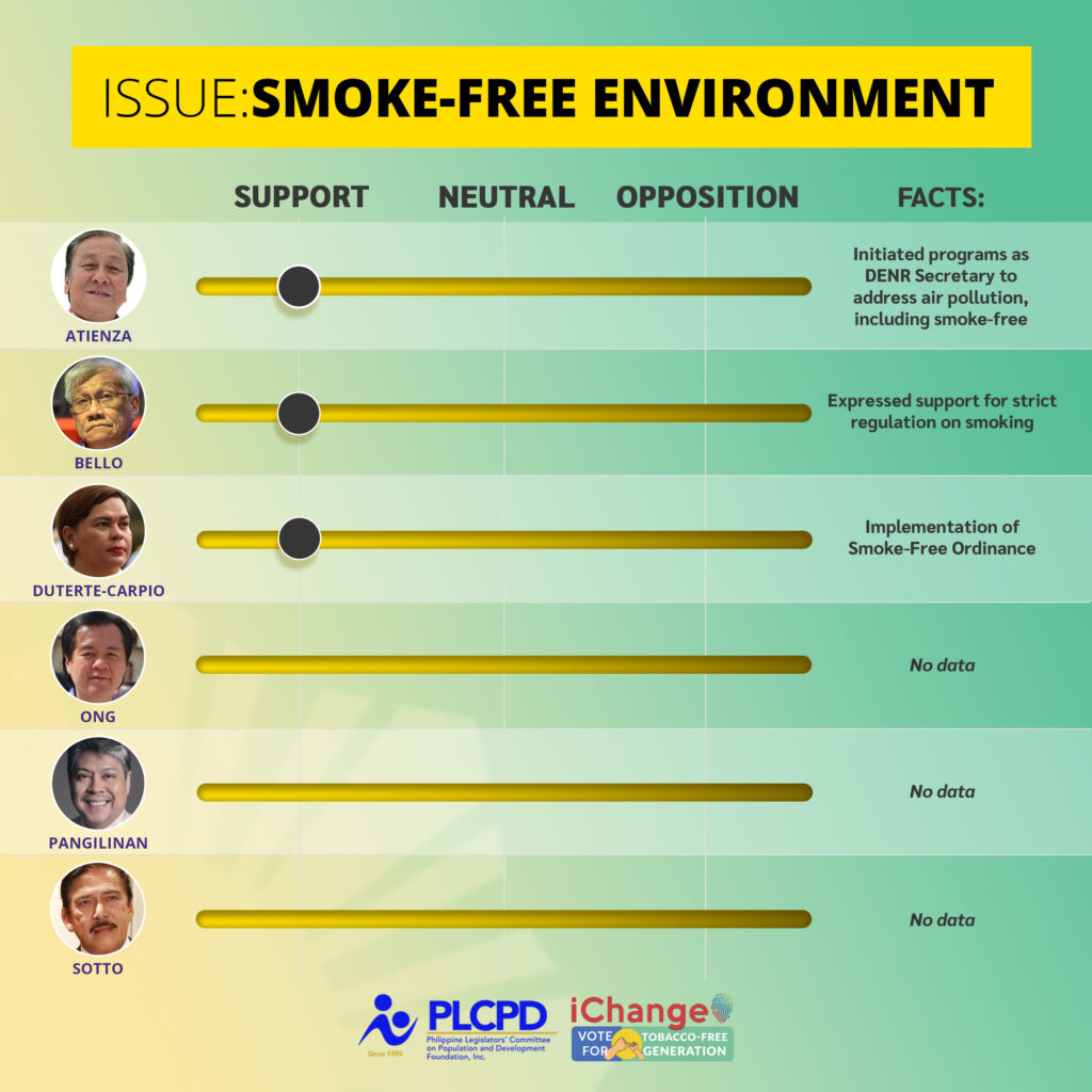 Smoke-free Environments. Policies that protect people from the harms of exposure to secondhand smoke by prohibiting smoking in public places and enclosed spaces as provided for by the Tobacco Regulation Act (RA 9211) and expanded by Executive Order 26 issued by President Duterte. Currently, there are moves to expand the definition of places where smoking can be prohibited under the law, and to prohibit the creation of designated smoking areas indoors.