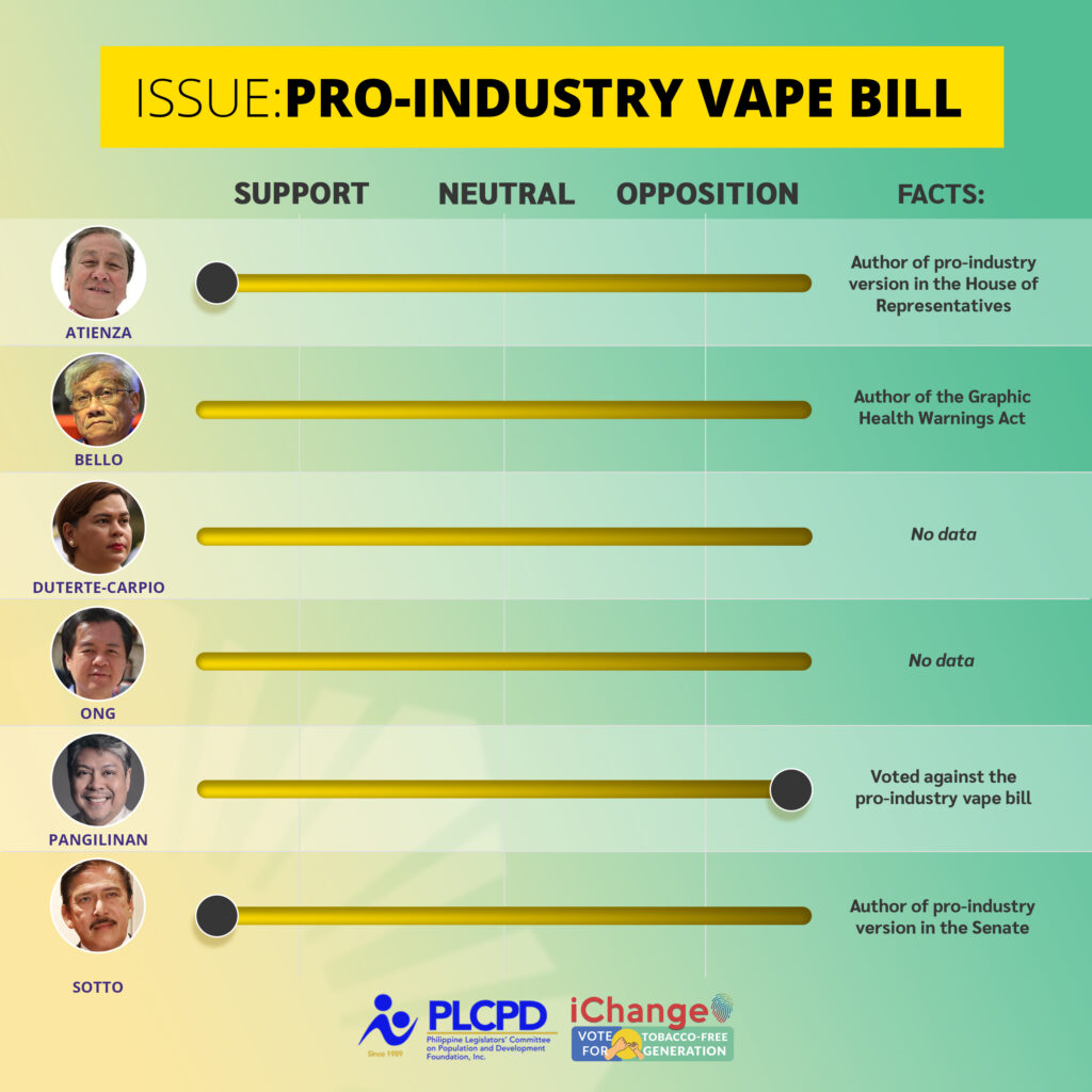 Pro-industry Vape Bill. Regulation of the importation, manufacture, sale, packaging, distribution, use, and communication of electronic nicotine and non-nicotine delivery systems (ENDS) and heated tobacco products (HTPs). According to the Word Health Organization, ENDS, also known as electronic cigarettes or vapes, are addictive and not harmless, and should be strictly regulated. Use of these products by adolescents can lead to nicotine addiction. In the Philippines, there is an existing regulatory framework for ENDS and HTPs that bans flavors, restricts sale and use to those below 21 years old and non-smokers, and assigns FDA as the lead regulatory agency. However, the recently passed Vape bill by Congress reverses these existing measures by allowing flavors, lowering the age restriction to 18, and transferring the regulation to DTI. The bill is being criticized by health advocates and advocates of children’s rights as anti-health, and anti- youth. The bill has been ratified by both houses of Congress to date.
